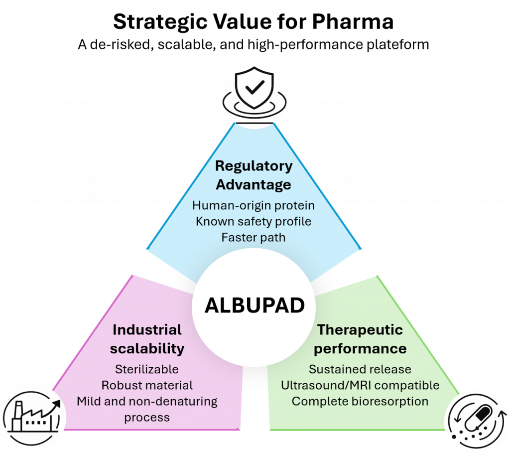 Albumin is inherently biocompatible, non-immunogenic, and widely used in approved formulations. Yet its potential as a structured solid matrix has remained inaccessible due to the lack of a controllable shaping technology. ALBUPAD fills this innovation gap by engineering albumin into stable solid forms – microdiscs, films, and 3D matrices – with tunable mechanical properties, porosity, and degradation kinetics.